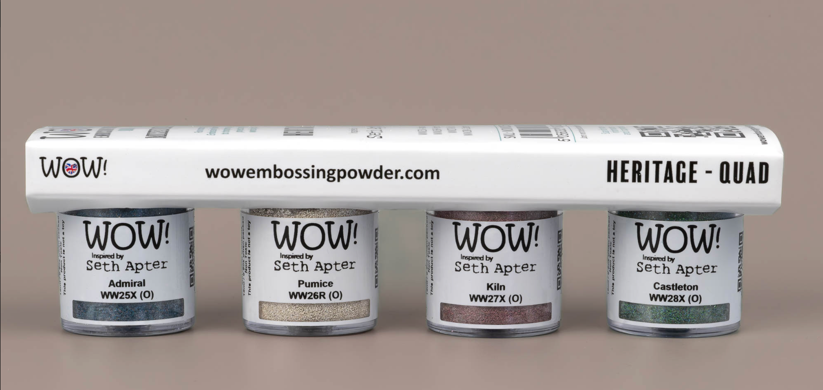 Step into layers of time and texture with the Heritage Quad, a limited edition release by Seth Apter for WOW! Embossing Powder. - These four new powders blend raw earthy tones with muted metallics and rugged opacity — the hallmarks of Seth’s unmistakable mixed media style.